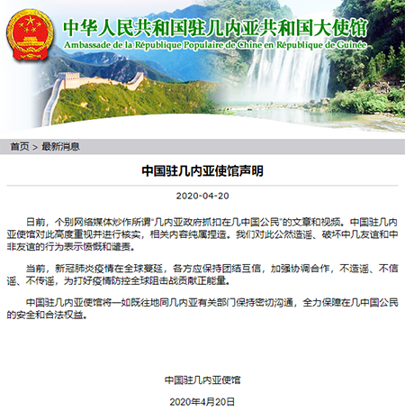 真相:4月20日,中國駐幾內(nèi)亞使館通過官方網(wǎng)站發(fā)布聲明表示,使館對此高度重視并進(jìn)行核實,相關(guān)內(nèi)容純屬捏造。對此公然造謠、破壞中幾友誼和中非友誼的行為表示憤慨和譴責(zé)。