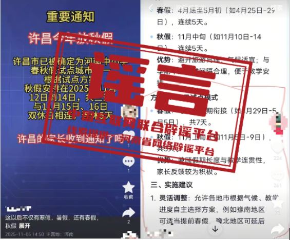 真相:近日,河南、安徽部分自媒體平臺(tái)發(fā)布關(guān)于中小學(xué)春秋放假的信息,聲稱“許昌市已被確定為河南中小學(xué)春秋假試點(diǎn)城市之一”“周口市中小學(xué)2025年秋假時(shí)間安排如下”“蕪湖市中小學(xué)將在11月12日至14日放首個(gè)秋假,連周末共5天”,引發(fā)關(guān)注。對此,河南許昌、周口及安徽蕪湖教育部門作出回應(yīng):并無放秋假的安排,網(wǎng)傳消息均為謠言。中小學(xué)放假安排需嚴(yán)格遵循國家教育方針政策及當(dāng)?shù)亟逃块T的統(tǒng)一部署,結(jié)合本地教育教學(xué)實(shí)際統(tǒng)籌規(guī)劃。如需了解相關(guān)安排,請通過屬地教育部門官方網(wǎng)站,切勿輕信、傳播未經(jīng)官方確認(rèn)的“小道消息”。(來源:“清朗河南”微信公眾號(hào)、@大河網(wǎng)、安徽網(wǎng)絡(luò)辟謠平臺(tái))