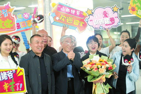 在接站口,“姥爺”接過記者遞上的鮮花,看到刊載報道他的4月2日的報紙,咧嘴一笑,一再說“謝謝,謝謝”,記者用鏡頭和文字記錄下這份喜悅。交城縣委宣傳部也派出了接機小分隊,打著“我們愛你,山西姥爺”等歡迎牌,把姥爺護送回家。