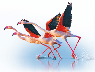 11月23日,初冬的運城濕地省級自然保護區(qū)(鹽湖段)水面澄澈,灘涂鋪展,火烈鳥亭亭玉立,時而低頭啄食,時而曲頸戲水,時而平展振翅。