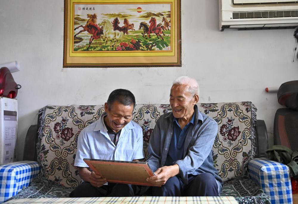 ↑桑春玉(右)向秦海松展示家里的老照片(2025年8月27日攝)。 秦海松也懂得感恩 跟著下地 他會(huì)幫忙除草、收菜 看到路邊的掃帚草 他會(huì)拔下來(lái)做成掃帚送給村民
