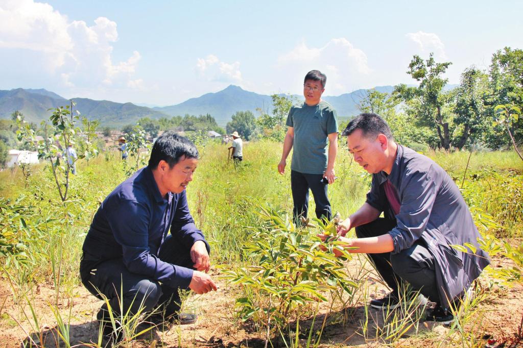 深秋季節(jié),由山西交控集團(tuán)駐五臺(tái)縣東雷鄉(xiāng)孟家坪村扶貧工作隊(duì)幫扶種植的480畝油用牡丹還在茁壯生長(zhǎng)。41戶入社脫貧戶依靠五臺(tái)農(nóng)商銀行金融扶貧的優(yōu)惠政策投資種植。到5年收獲期,年可創(chuàng)產(chǎn)值96萬(wàn)元,戶均收入2.3萬(wàn)元。圖為工作隊(duì)員在察看油用牡丹長(zhǎng)勢(shì)。 俊賢 先良 攝