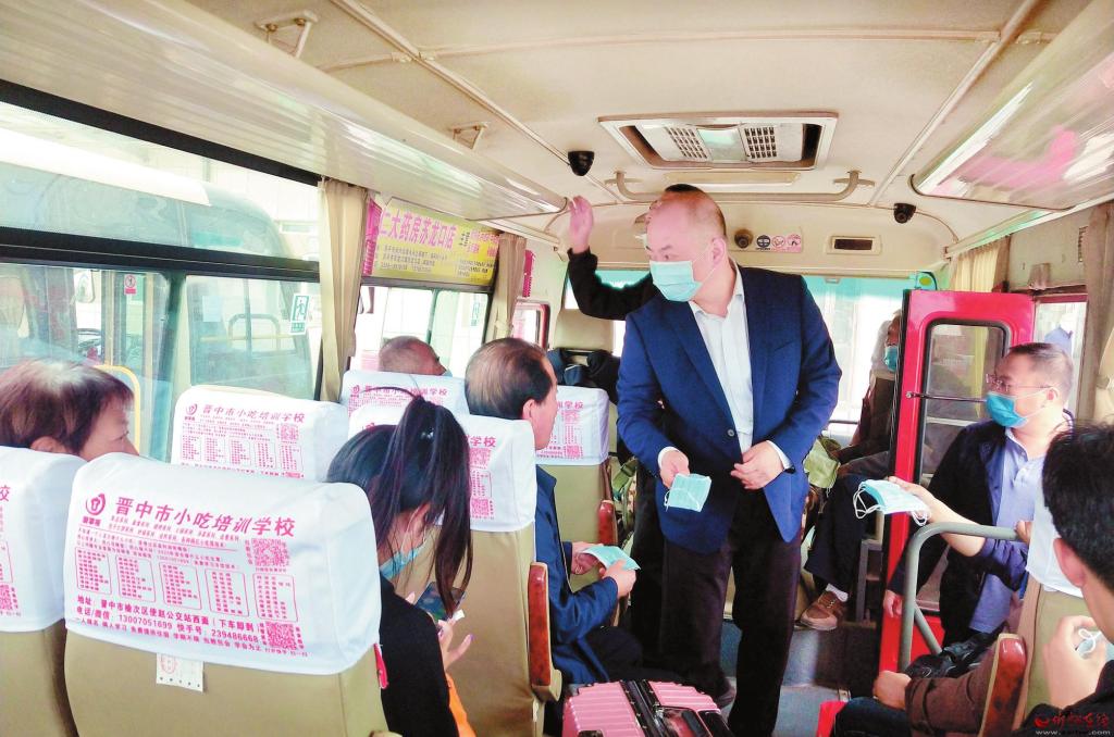 原平市交通運(yùn)輸局加強(qiáng)對(duì)交通運(yùn)輸企業(yè)、“兩客一危一貨”、旅游包車、網(wǎng)絡(luò)包車和重點(diǎn)路段的監(jiān)督檢查,嚴(yán)厲打擊“三超一疲勞”、非法載客、超員超限、疲勞駕駛和違規(guī)冒險(xiǎn)行車等違法違規(guī)行為。在抓安全的同時(shí),將疫情防控常態(tài)化,強(qiáng)調(diào)汽車站工作人員必須做好登記工作,督促乘客佩戴口罩。圖為工作人員在客車上為旅客發(fā)放口罩。( 劉建春 攝)