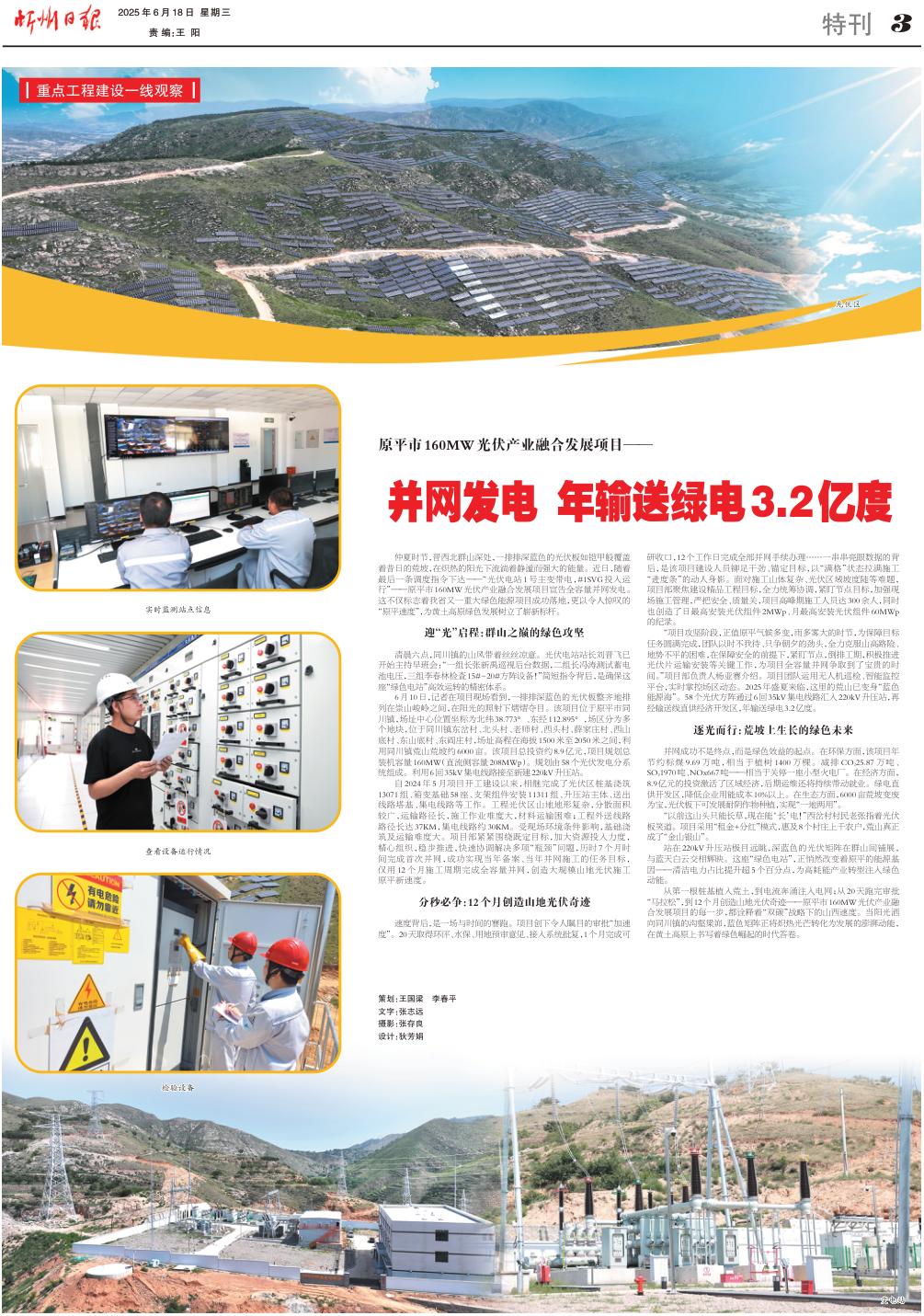 仲夏時(shí)節(jié),晉西北群山深處,一排排深藍(lán)色的光伏板如鎧甲般覆蓋著昔日的荒坡,在熾熱的陽(yáng)光下流淌著靜謐而強(qiáng)大的能量。近日,隨著最后一條調(diào)度指令下達(dá)——“光伏電站1號(hào)主變帶電,#1SVG投入運(yùn)行”——原平市160MW光伏產(chǎn)業(yè)融合發(fā)展項(xiàng)目宣告全容量并網(wǎng)發(fā)電。這不僅標(biāo)志著我省又一重大綠色能源項(xiàng)目成功落地,更以令人驚嘆的“原平速度”,為黃土高原綠色發(fā)展樹(shù)立了嶄新標(biāo)桿。