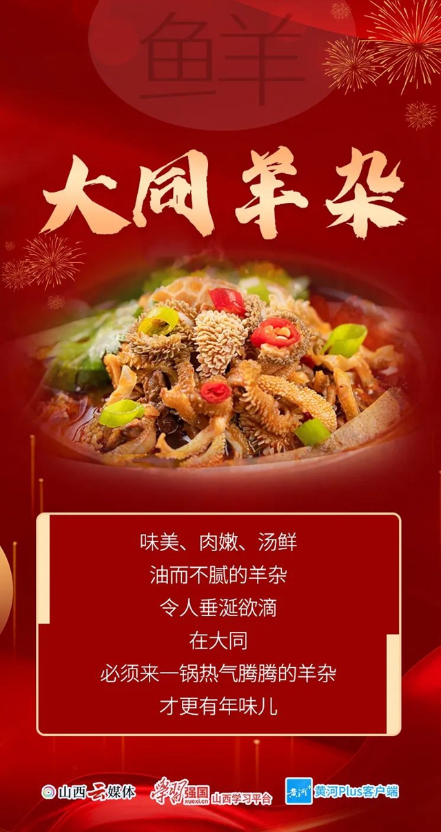 看了這么多 口水是不是都流下來(lái)了 山西的美食可不止這些 平遙牛肉、五寨燴菜、解州羊肉泡饃 平定扣肉、高平十大碗…… 數(shù)都數(shù)不過(guò)來(lái) 都是獨(dú)具特色的地道山西味兒 小伙伴們 你們過(guò)年喜歡吃什么 (責(zé)任編輯:梁艷) |