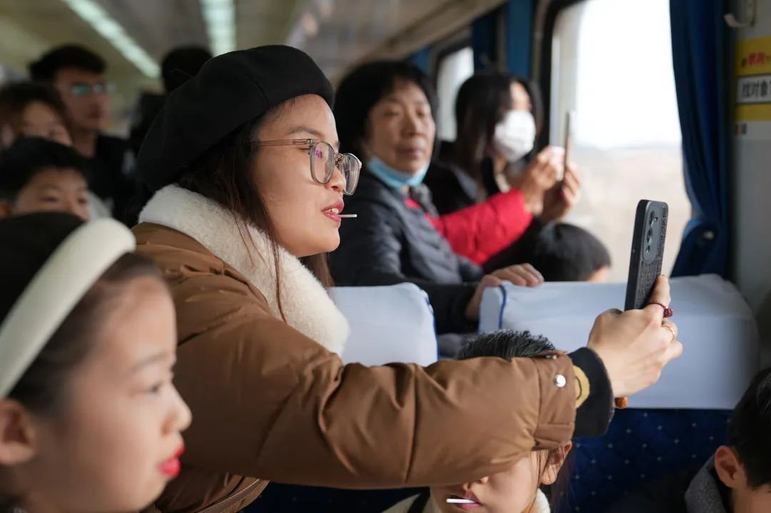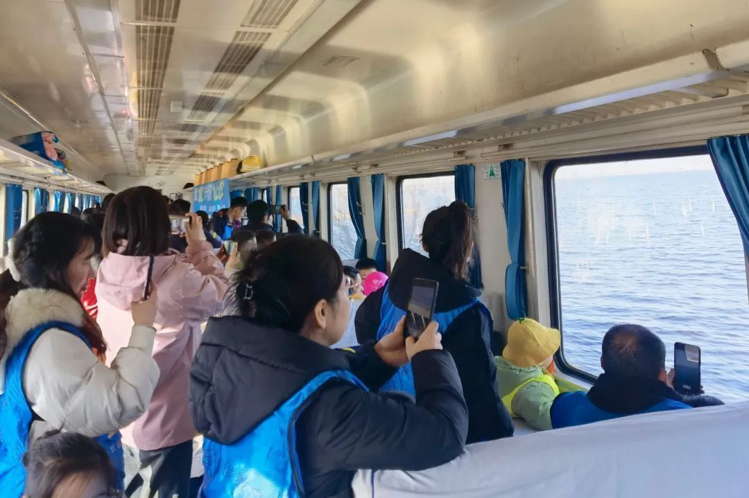 列車駛出運城站,工作人員開始為旅客熱心介紹打卡拍照的最佳地點和周邊的名勝古跡,并且精心準(zhǔn)備了小道具,方便大家打卡拍照。 水上美景:夢幻+浪漫 約9時52分 列車運行至硝池灘 旅客仿佛置身于 大美山水畫卷之中