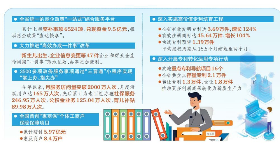 營(yíng)商環(huán)境是企業(yè)生存發(fā)展的土壤?!笆奈濉币詠?lái),我省始終將優(yōu)化營(yíng)商環(huán)境作為高質(zhì)量發(fā)展的關(guān)鍵支撐。全省市場(chǎng)監(jiān)管系統(tǒng)、審批服務(wù)系統(tǒng)立足職能、改革創(chuàng)新、攻堅(jiān)克難,從政務(wù)服務(wù)、數(shù)字賦能、市場(chǎng)監(jiān)管、質(zhì)量安全等多維度發(fā)力,推動(dòng)全省營(yíng)商環(huán)境持續(xù)優(yōu)化、市場(chǎng)活力充分迸發(fā),為全省全方位轉(zhuǎn)型發(fā)展筑牢堅(jiān)實(shí)基礎(chǔ)。