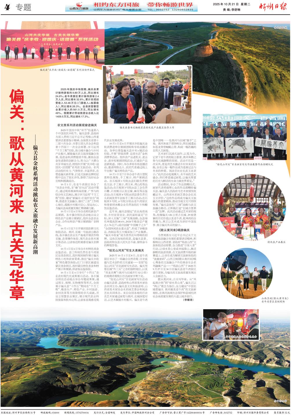 2025年國慶中秋“雙節(jié)”恰逢第八個中國農民豐收節(jié),偏關縣委、縣政府為深入貫徹習近平總書記考察山西重要講話重要指示精神,全面落實省委十二屆十次全會、市委五屆九次全會和縣委十四屆十一次全會部署,學習運用“千萬工程”經驗,助力城鄉(xiāng)融合與鄉(xiāng)村產業(yè)振興,賦能偏關農文旅深度融合發(fā)展,促進金秋消費提質升級,激揚全縣奮發(fā)進取的創(chuàng)新合力,努力讓廣大群眾共享幸福生活,特組織開展“慶豐收·迎國慶·話團圓”系列農文旅活動。系列活動組織有力、氣勢恢宏、豐富多彩,在塑造偏關新形象、打造文旅新品牌的征程中邁出了堅實步伐,取得了良好社會反響和圓滿成功。
