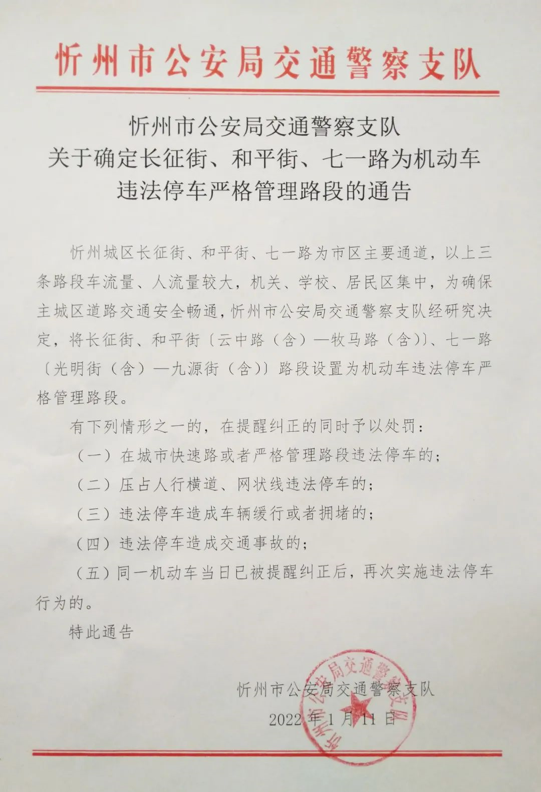 忻州城區(qū)長征街、和平街、七一路為市區(qū)主要通道,以上三條路段車流量、人流量較大,機關、學校、居民區(qū)集中,為確保主城區(qū)道路交通安全暢通,忻州市公安局交通警察支隊經研究決定,將長征街、和平街[云中路(含)-牧馬路(含)]、七一路[光明街(含)-九原街(含)]路段設置為機動車違法停車嚴格管理路段。