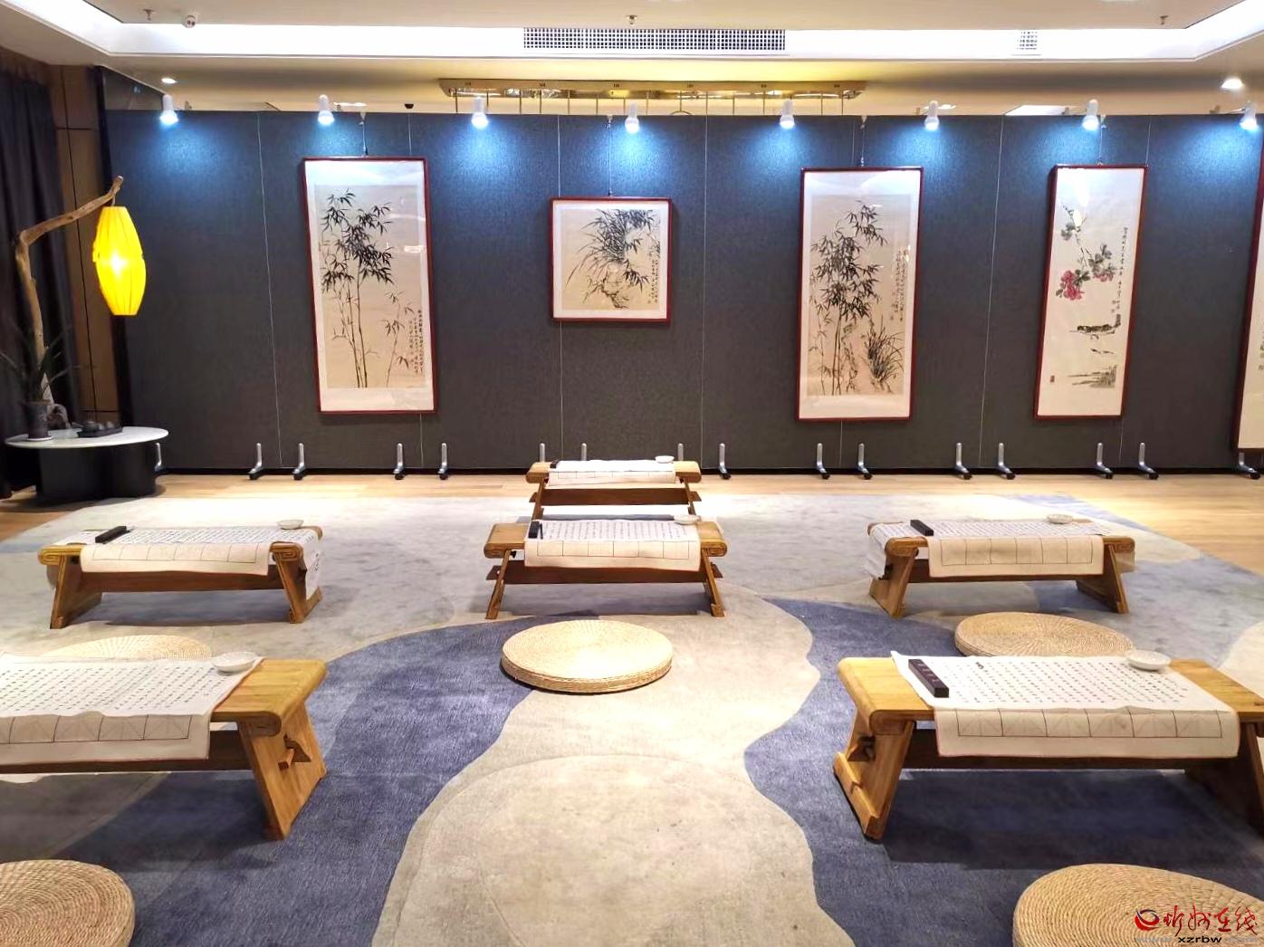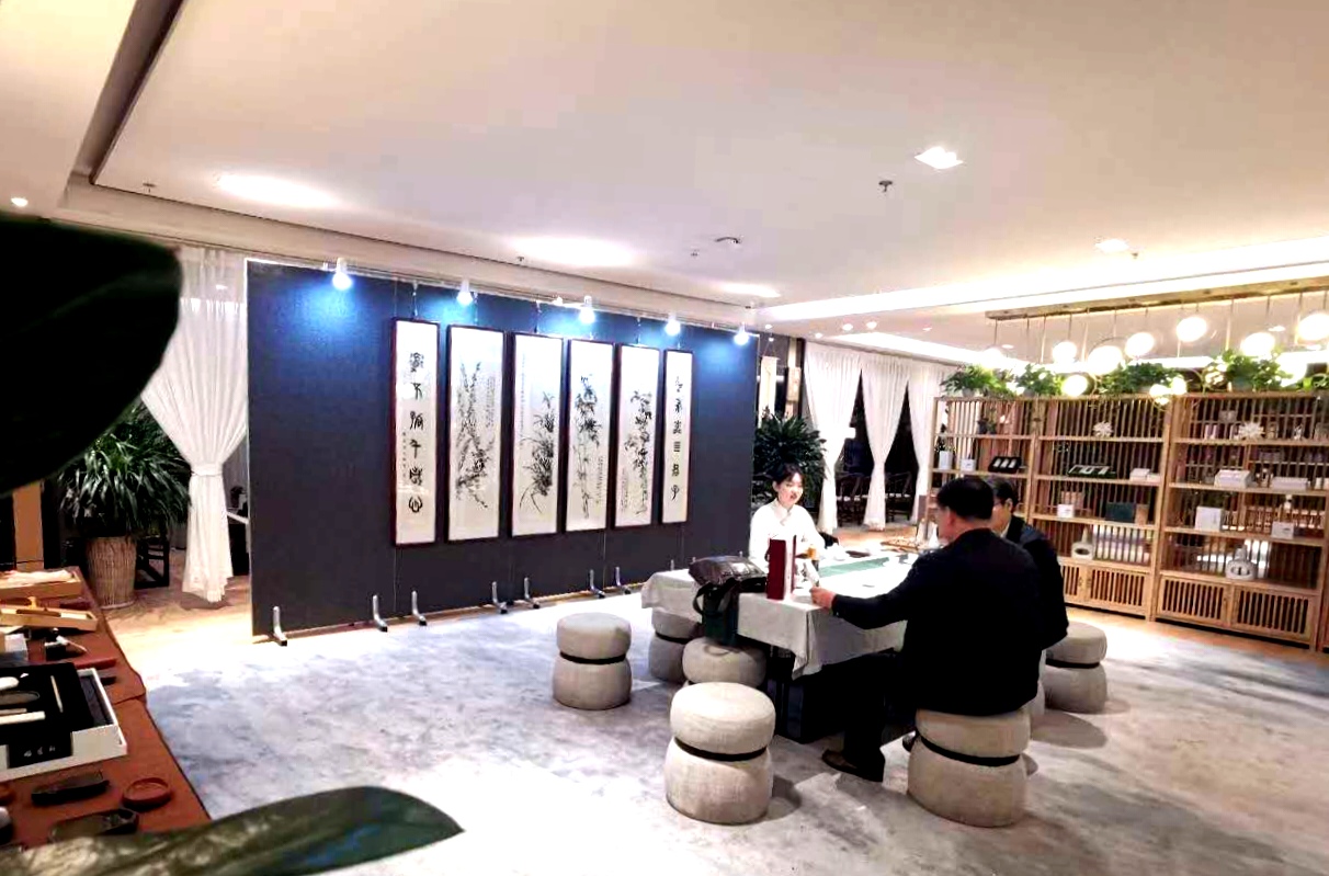 繞過木架綠植,穿行于鋪陳有字貼宣紙的書案,現(xiàn)場(chǎng)彈奏的琵琶古韻從耳畔飄過,茶香伴著墨香沁人心脾。你可以駐足細(xì)品這些書畫的精微高超之處,你可以圍桌而坐品茗閑談,興起時(shí)你還可以搖管潑墨揮灑一番……