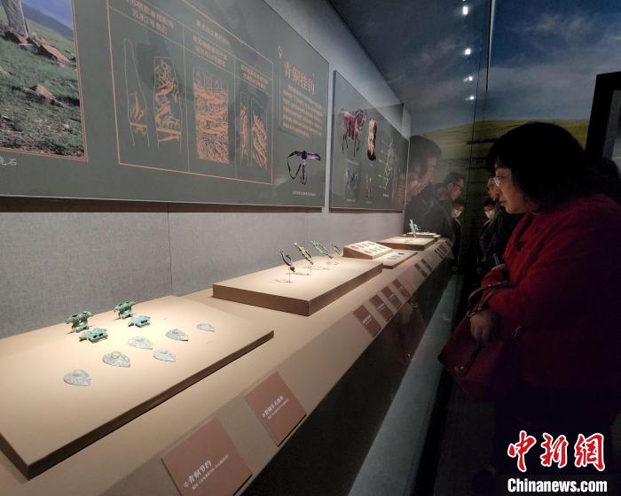 記者在展廳內(nèi)看到,眾多青銅制品以動(dòng)物形象為裝飾題材,猛虎、野狼、駿馬、鷹隼等姿態(tài)奔放、形象生動(dòng),折射游牧民族對生命力的崇拜。