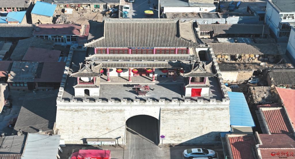 據(jù)重修鼓樓碑和《道光、光緒繁峙縣志》記載,該鼓樓始建于明代萬歷十四年(1586),清康熙二十七年(1688)維修,清乾隆二十三年(1758)增設(shè)鐘樓、鼓樓,光緒二年(1878)重修,現(xiàn)存建筑為明、清建筑。城臺呈方形,條石筑基,青磚鋪面,內(nèi)為夯土。臺基中設(shè)拱券門洞,南北貫通。城樓內(nèi)供奉文昌神,又稱為文昌閣,面寬五間,進深四椽,七檁前后廊構(gòu)架,二層三檐歇山頂,上層斗拱一斗二升交麻葉,下層明間設(shè)拱券門,次間圓形窗,四角施通天柱,內(nèi)設(shè)樓梯,可登二層。