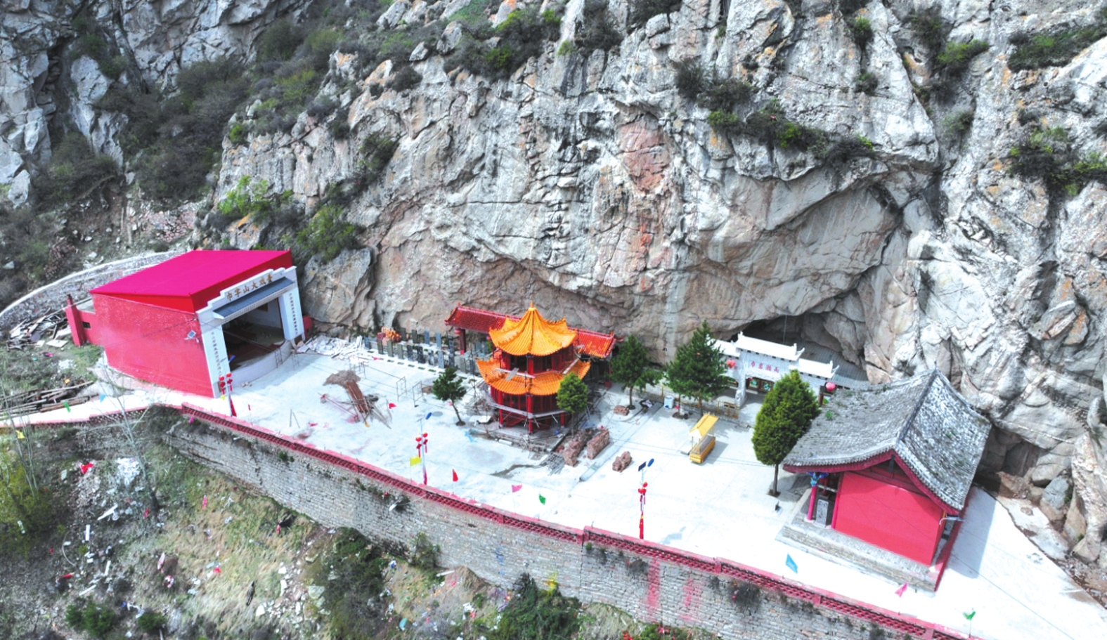春日里,山桃花與山杏花沿坡綻放,粉白相間的花海從山腳漫至山腰,與翠綠的松柏相映成趣。此時若恰逢細雨,云霧在花間游走,“巾巖瀨雨”的奇景尤為靈動,水滴擊石的清音與花開的簌簌聲交織,仿佛天地間的私語。盛夏時節(jié),山中松濤陣陣,涼意襲人。雙巾峰下的“沁心泉”水量充沛,泉水清冽甘醇,飲之可去暑熱。沿山路行至“回音壁”,一聲呼喊能引來七聲回應(yīng),故又稱“七響巖”。傍晚時分,夕陽為石灰?guī)r峰巒鍍上金邊,池面波光粼粼,形成“巾峰夕照”的景致,與“瀨雨”并稱山中雙絕。秋日登高,則見株株松樹挺拔直立,廟宇與油松交相輝映,層林盡染。此時“瀨雨”之景尤為別致,洞內(nèi)泉水如鐘表滴答,當(dāng)?shù)厝朔Q為“秋漏”。有現(xiàn)代詩人描繪此景:“巾巖雄峙,霧繞云纏多靈氣;瀨雨淋漓,珠垂墜玉一奇觀?!毙蜗蟮匕炎匀恢襞c時間之感巧妙融合。冬雪初霽時,巾字山銀裝素裹,雙巾峰如白玉雕琢的冠冕,“瀨雨”洞洞外凝結(jié)的冰棱如水晶簾幕,陽光折射下七彩斑斕,構(gòu)成冬日里的清麗樂章。