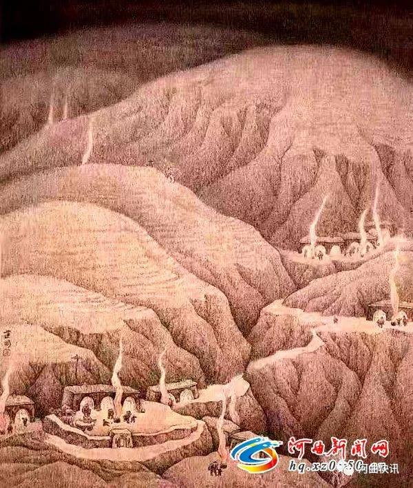 你看,窯洞前沖天的火柱,歡騰的男男女女,老老少少……一切都是如夢(mèng)、如幻、溫馨、細(xì)膩、生機(jī)勃勃而又那么單純、自然……作品精工寫(xiě)實(shí),整體上卻又有圖案化的簡(jiǎn)潔,大塊面的融入無(wú)邊黑夜的“塬”占據(jù)畫(huà)面的主體,形成一種渾厚、蒼茫的氣氛,象征著一種太古和永恒,而點(diǎn)綴其間的嫋嫋升騰的除夕旺火又使這蒼茫的古“塬”富有生機(jī)。