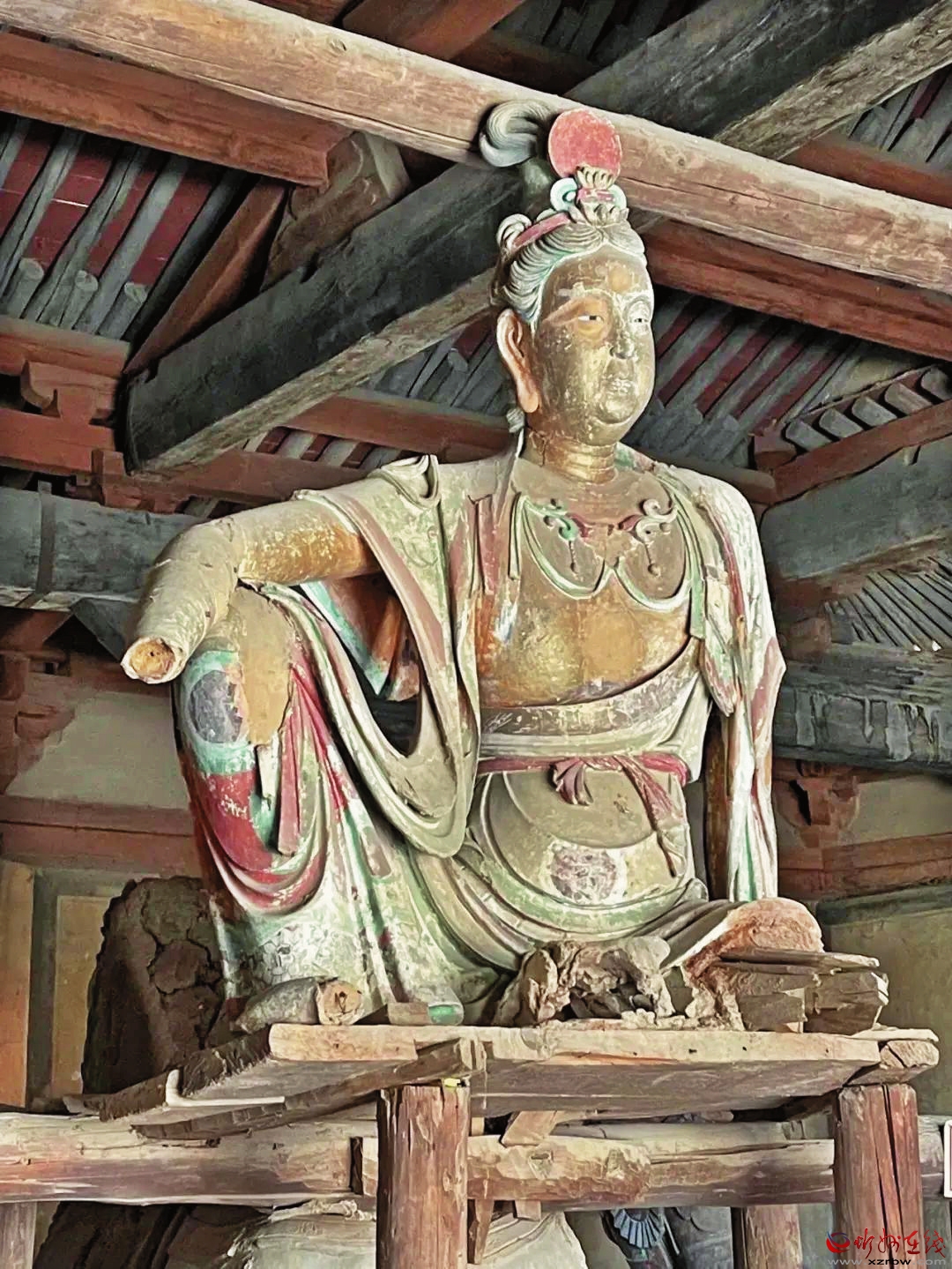 巖山寺坐北朝南,平面呈不規(guī)則長方形。寺內正殿已毀,現(xiàn)存建筑主要有文殊殿、伽藍殿、地藏殿、馬王殿等。其中,文殊殿面闊五間,進深六椽,單檐歇山頂。殿內保存有金代彩塑水月觀音、脅侍、天王和文殊坐騎等。水月觀音面額豐腴,衣帶飄灑,若乘風翩翩欲飛。