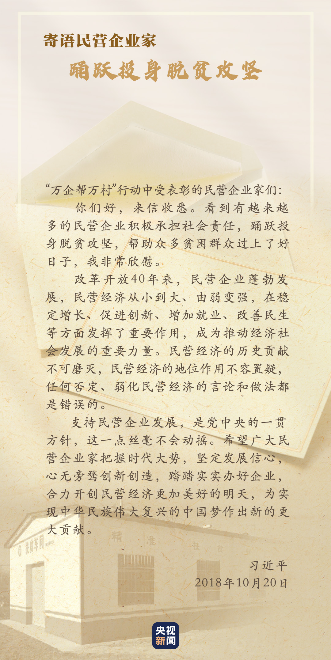 習(xí)近平對民營企業(yè)高度重視,給“萬企幫萬村”行動中受表彰的民營企業(yè)家回信,對他們踴躍投身脫貧攻堅(jiān)予以肯定,勉勵廣大民營企業(yè)家堅(jiān)定發(fā)展信心,踏踏實(shí)實(shí)辦好企業(yè)。