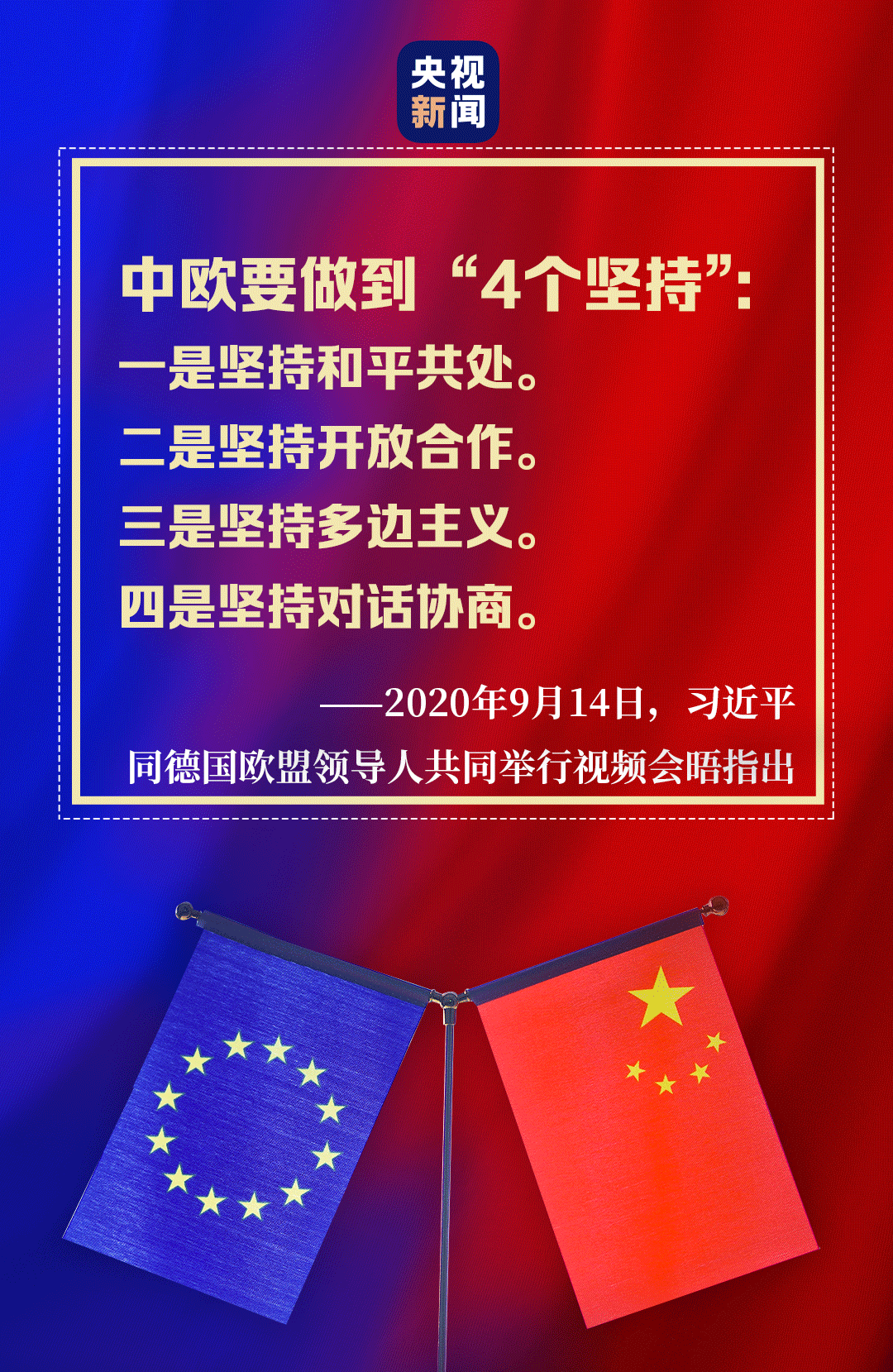 中歐相互尊重、求同存異、和而不同,不斷增進(jìn)彼此理解和信任,在合作中擴(kuò)大共同利益,在發(fā)展中破解難題。在當(dāng)天的視頻會(huì)晤中,習(xí)近平強(qiáng)調(diào),中歐要做到“4個(gè)堅(jiān)持”。