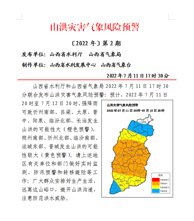 山西省水利廳和山西省氣象局2022年7月11日17時30分聯(lián)合發(fā)布山洪災(zāi)害氣象風(fēng)險預(yù)警:預(yù)計,2022年7月11日20時至7月12日20時,強(qiáng)降雨可致忻州南部、呂梁、太原、晉中、陽泉、臨汾北部、長治發(fā)生山洪的可能性大(橙色預(yù)警),朔州南部、忻州北部、臨汾南部、運城東部、晉城發(fā)生山洪的可能性較大(黃色預(yù)警)。