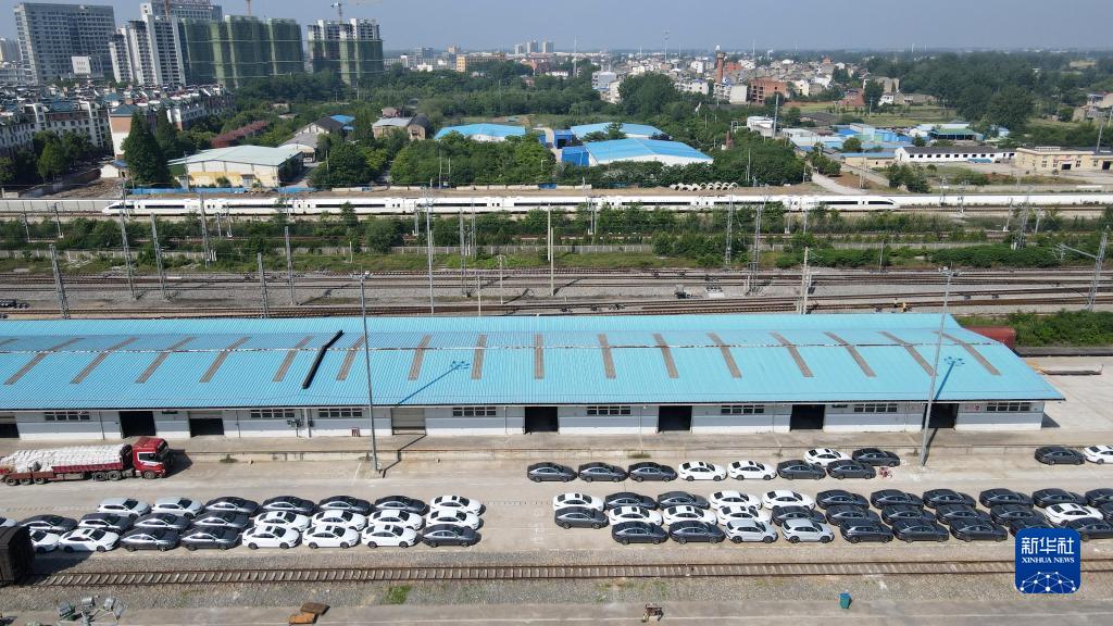 這是位于合肥市長豐縣的鐵路水家湖貨運站等待裝車外運的新能源汽車(5月9日,無人機照片)。新華社記者 劉軍喜 攝