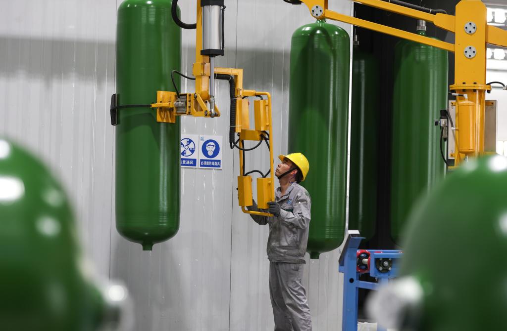5月31日,一名工作人員在江蘇國(guó)富氫能技術(shù)裝備股份有限公司的儲(chǔ)氫罐生產(chǎn)車(chē)間內(nèi)作業(yè)。新華社記者 楊磊 攝