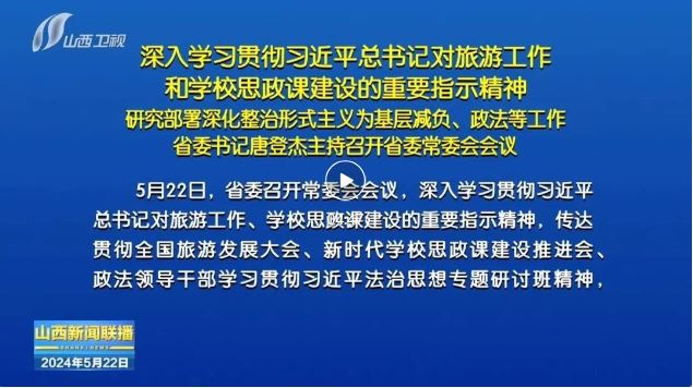山西日?qǐng)?bào)報(bào)道 5月22日,省委召開常委會(huì)會(huì)議,深入學(xué)習(xí)貫徹習(xí)近平總書記對(duì)旅游工作、學(xué)校思政課建設(shè)的重要指示精神,傳達(dá)貫徹全國旅游發(fā)展大會(huì)、新時(shí)代學(xué)校思政課建設(shè)推進(jìn)會(huì)、政法領(lǐng)導(dǎo)干部學(xué)習(xí)貫徹習(xí)近平法治思想專題研討班精神,研究部署深化整治形式主義為基層減負(fù)工作。省委書記唐登杰主持會(huì)議。