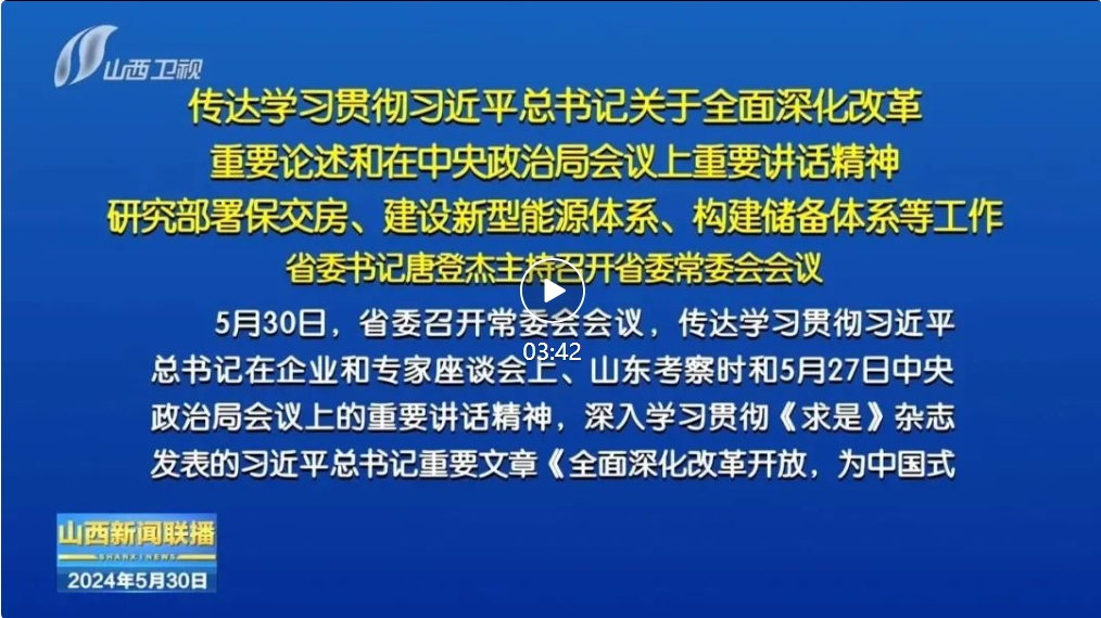 山西日?qǐng)?bào)報(bào)道 5月30日,省委召開常委會(huì)會(huì)議,傳達(dá)學(xué)習(xí)貫徹習(xí)近平總書記在企業(yè)和專家座談會(huì)上、山東考察時(shí)和5月27日中央政治局會(huì)議上的重要講話精神,深入學(xué)習(xí)貫徹《求是》雜志發(fā)表的習(xí)近平總書記重要文章《全面深化改革開放,為中國(guó)式現(xiàn)代化持續(xù)注入強(qiáng)勁動(dòng)力》,傳達(dá)貫徹全國(guó)切實(shí)做好保交房工作視頻會(huì)議精神,審議通過(guò)《山西省加快規(guī)劃建設(shè)新型能源體系的實(shí)施意見》《關(guān)于構(gòu)建山西省儲(chǔ)備體系的行動(dòng)方案》。省委書記唐登杰主持會(huì)議。