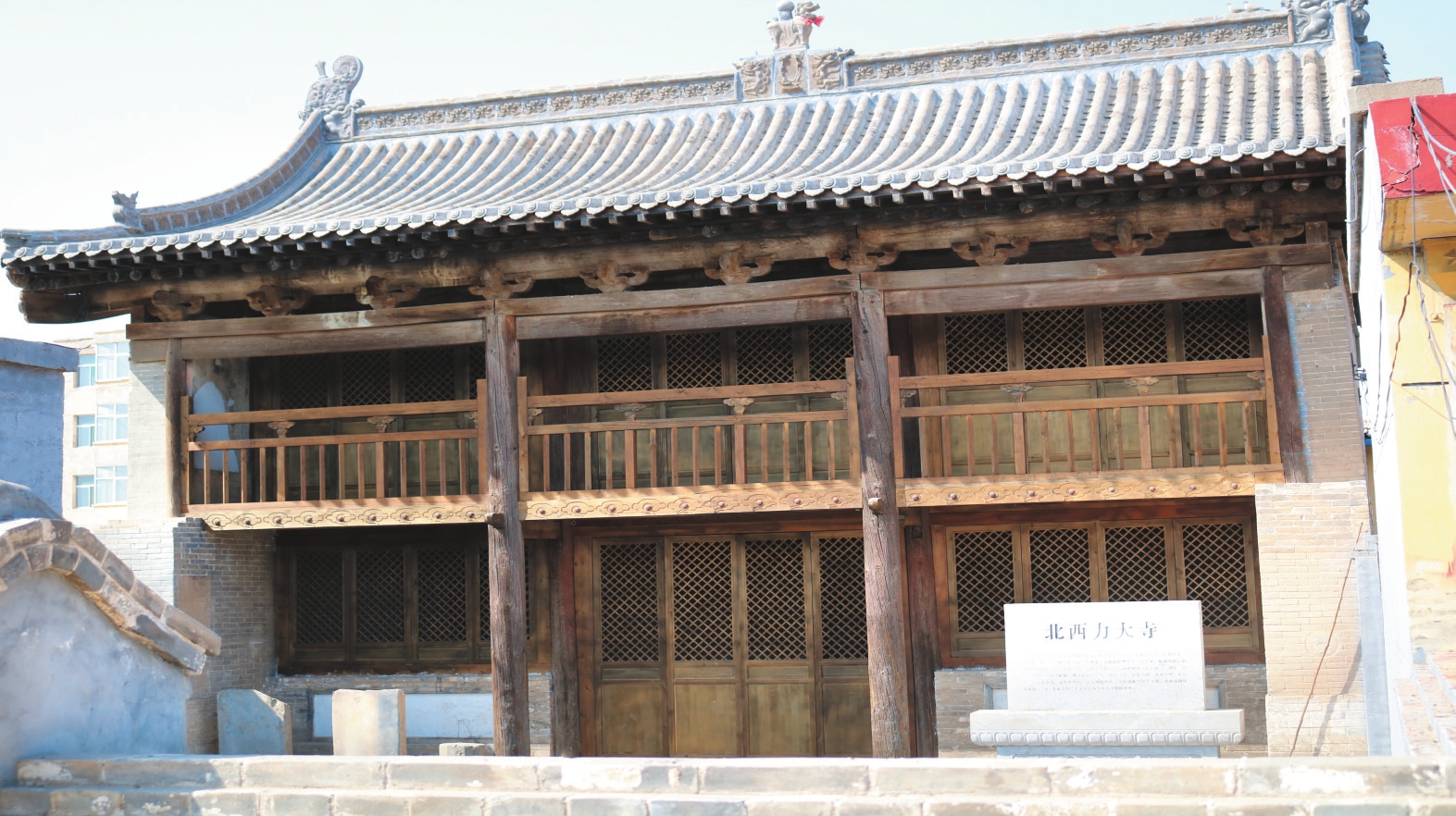 北西力大寺位于定襄縣晉昌鎮(zhèn)北西力村中,坐北朝南,東西長11.1米、南北寬8.4米,占地面積約93平方米。據(jù)梁架題記記載為明萬歷四十三年(1615)所建。該寺沿中軸線原建有山門、過廳、正殿,兩側(cè)建有東西配房?,F(xiàn)僅存正殿,為二層樓閣式結(jié)構(gòu),面寬三間,進(jìn)深四椽,前設(shè)廊,單檐懸山頂,五檁架結(jié)構(gòu)。二層廊前兩側(cè)有人物壁畫約4平方米。2015年8月25日公布為市級文物保護(hù)單位。