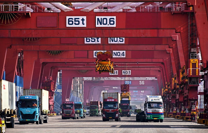 2024年2月11日,卡車在青島港集裝箱碼頭裝運(yùn)集裝箱。新華社記者 李紫恒 攝