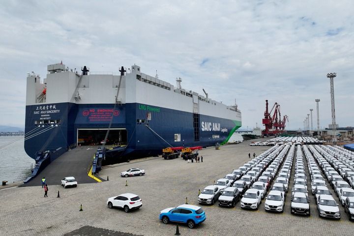 2024年1月23日,在福建廈門東渡港區(qū)現(xiàn)代碼頭,出口車輛陸續(xù)駛上“上汽安吉申誠”號汽車滾裝船(無人機(jī)照片)。新華社記者 姜克紅 攝