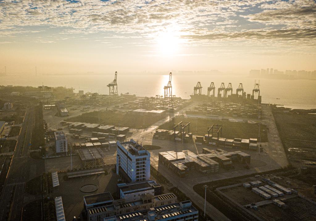 2024年1月1日在海南省洋浦經(jīng)濟開發(fā)區(qū)拍攝的海南自貿港集裝箱航運樞紐——洋浦國際集裝箱碼頭(無人機照片)。新華社記者 蒲曉旭 攝