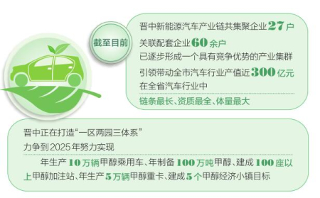 目前,晉中正在打造“一區(qū)兩園三體系”,即以國家級甲醇經(jīng)濟示范區(qū)為引領(lǐng),以汽車裝備制造園和綠色甲醇循環(huán)經(jīng)濟產(chǎn)業(yè)園為支撐,形成核心主導產(chǎn)業(yè)、支撐服務(wù)產(chǎn)業(yè)、示范應用場景三大產(chǎn)業(yè)體系。力爭到2025年努力實現(xiàn)年生產(chǎn)10萬輛甲醇乘用車、年制備100萬噸甲醇、建成100座以上甲醇加注站、年生產(chǎn)5萬輛甲醇重卡、建成5個甲醇經(jīng)濟小鎮(zhèn)目標,建設(shè)“車、醇、運、站、捕”全鏈條的經(jīng)濟生態(tài),打造原料生產(chǎn)、汽車制造、服務(wù)配套、基礎(chǔ)支撐、場景應用的全產(chǎn)業(yè)鏈示范路線,推動甲醇汽車應用規(guī)模向萬輛進軍,打造千億級甲醇經(jīng)濟高能級產(chǎn)業(yè)版圖。