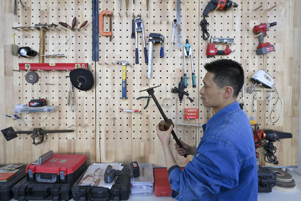 4月15日,在云岡研究院可移動文物修復(fù)室,工作人員孫麗娜在進(jìn)行鐵器修復(fù)。