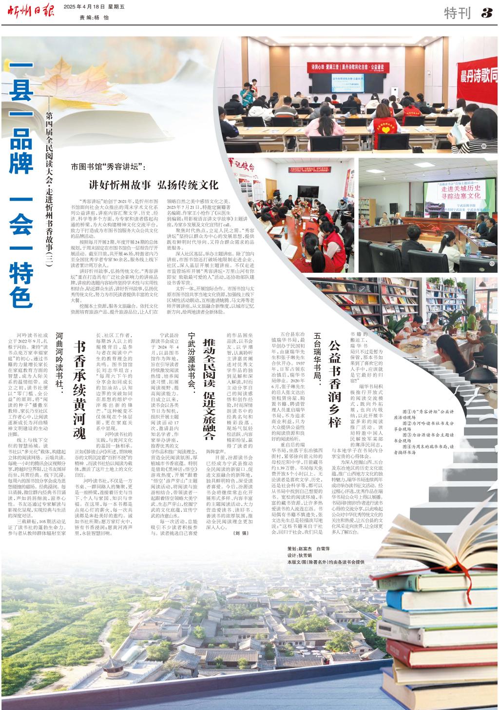 目前,汾源讀書(shū)會(huì)已經(jīng)成為寧武縣推動(dòng)全民閱讀的新窗口、促進(jìn)文旅融合的新陣地,獨(dú)具鮮明特色,深受讀者喜愛(ài)。今后,汾源讀書(shū)會(huì)將繼續(xù)常態(tài)化開(kāi)展形式多樣、內(nèi)容豐富的主題閱讀活動(dòng),大力營(yíng)造愛(ài)讀書(shū)、讀好書(shū)、善讀書(shū)的濃厚氛圍,推動(dòng)全民閱讀理念更加深入人心。(劉強(qiáng))