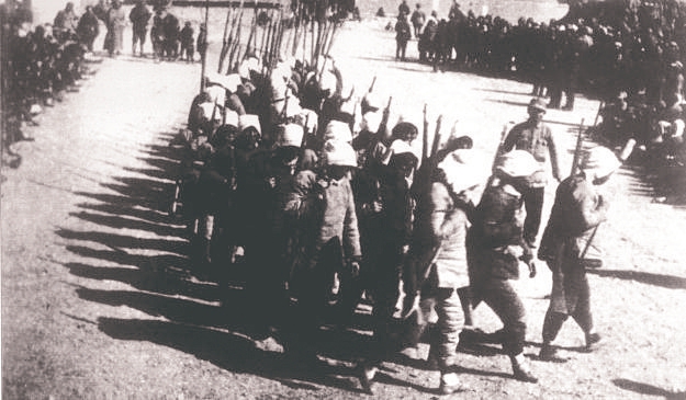 圖2 山西新軍既是戰(zhàn)斗隊(duì),又是工作隊(duì)。他們走到哪里,宣傳到哪里,動(dòng)員青年參軍;組織人民武裝自衛(wèi)隊(duì)、游擊隊(duì);協(xié)助地方建黨、建政,組建工、農(nóng)、青、婦等群眾團(tuán)體,創(chuàng)建抗日根據(jù)地。圖為1938年初,決死隊(duì)?wèi)?zhàn)士在沁縣書(shū)寫(xiě)宣傳標(biāo)語(yǔ)。