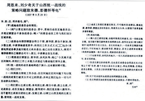 圖1 1937年9月20日,周恩來(lái)、劉少奇關(guān)于山西統(tǒng)一戰(zhàn)線的策略問(wèn)題致朱德、彭德懷等電。