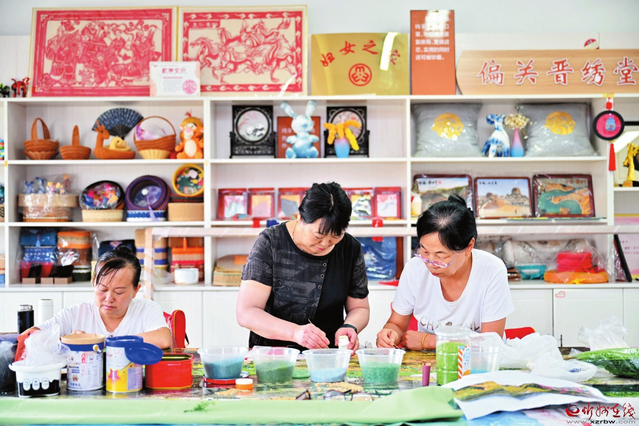 2019年,在偏關(guān)縣政府的支持下,郝果葉辦起了晉繡堂。從基礎(chǔ)針法,到設(shè)計(jì)圖案、把控品質(zhì),她手把手帶徒傳藝。馬梁村的周雪琴是最早來學(xué)的一批人中的一個(gè),家中有個(gè)聾啞兒子需要照顧,日子過得緊巴巴。初學(xué)時(shí),粗糙的手指捏不住繡花針,如今靠刺繡月入近3000元,“比種地輕快,還能守著娃,這雙手讓她有了底氣?!蓖ㄟ^開展專業(yè)培訓(xùn),郝果葉幫助300多名婦女學(xué)習(xí)傳統(tǒng)手藝。晉繡堂成了她們“第二個(gè)家”,在這里,針尖挑起的不只是絲線,還有挺直的腰桿和亮堂的明天。