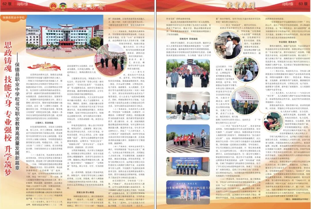 回首過(guò)去,保德縣職業(yè)中學(xué)校以堅(jiān)定的信念和扎實(shí)的行動(dòng),在立德樹(shù)人、技能培育、人才輸送、服務(wù)社會(huì)等方面交出了一份亮眼的答卷。展望未來(lái),學(xué)校將繼續(xù)堅(jiān)守“為黨育人、為國(guó)育才”的初心使命,牢牢把握職業(yè)教育發(fā)展的歷史機(jī)遇,持續(xù)深化教育教學(xué)改革,不斷強(qiáng)化內(nèi)涵建設(shè),提升辦學(xué)質(zhì)量。努力將學(xué)校建設(shè)成為一所“當(dāng)?shù)仉x不開(kāi)、業(yè)內(nèi)都認(rèn)同、國(guó)際可交流”的高水平中等職業(yè)學(xué)校,為培養(yǎng)更多高素質(zhì)技術(shù)技能人才、能工巧匠、大國(guó)工匠,為助力保德縣及區(qū)域經(jīng)濟(jì)社會(huì)高質(zhì)量發(fā)展,為全面建設(shè)社會(huì)主義現(xiàn)代化國(guó)家、實(shí)現(xiàn)中華民族偉大復(fù)興的中國(guó)夢(mèng)貢獻(xiàn)更大的職教力量!